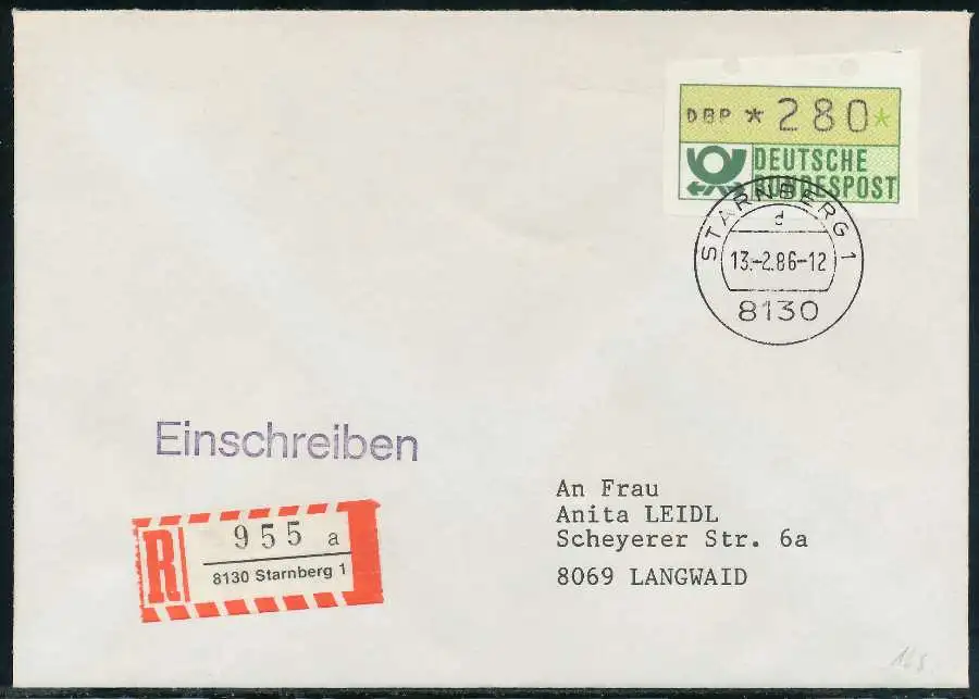 Einschreiben mit ATM1-280, beiliegend der Einlieferungsschein, etwas verschnitten