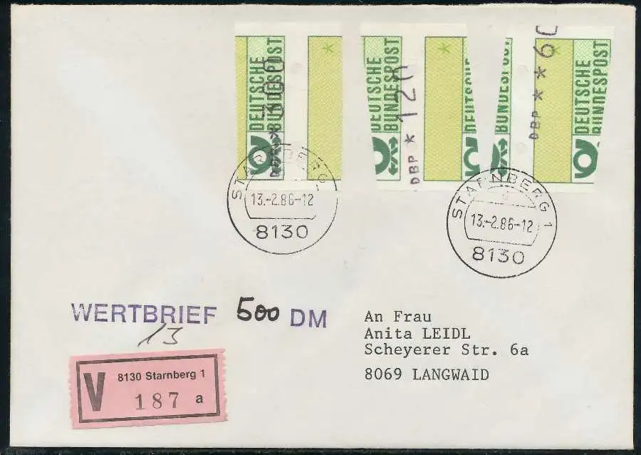 Versiegelter Wertbrief 500 DM mit ATM1-300 und 120 und 060, sogenannter "Starnberger Reiter bzw. Starnberger Springer", beiliegend der Einlieferungsschein und Quittung des Automaten mit Datum 13.02.1986