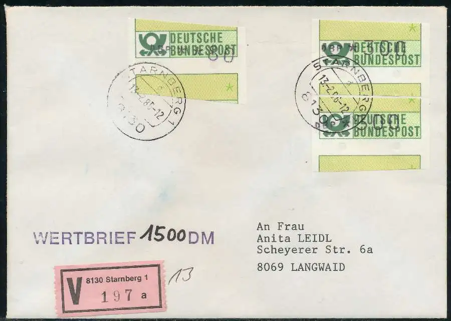 Versiegelter Wertbrief 1500 DM mit ATM1-300 und 080, sogenannter "Starnberger Reiter bzw. Starnberger Springer", beiliegend der Einlieferungsschein und Quittung des Automaten mit Datum 13.02.1986