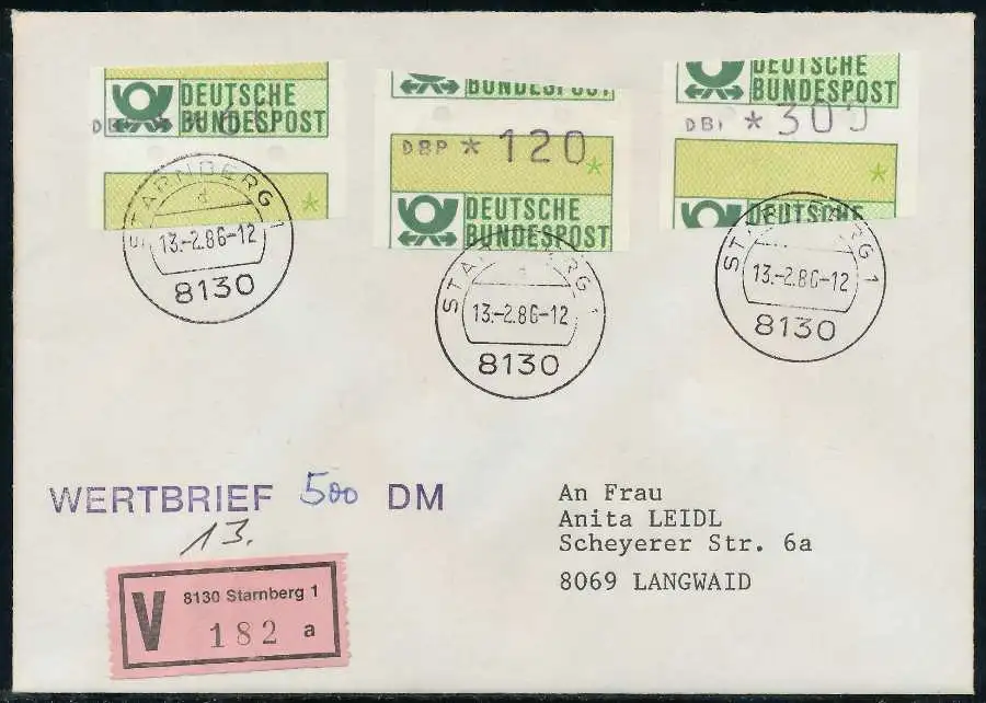 Versiegelter Wertbrief 500 DM mit ATM1-300 und 120 und 060, sogenannter "Starnberger Reiter bzw. Starnberger Springer", beiliegend der Einlieferungsschein und Quittung des Automaten mit Datum 13.02.1986