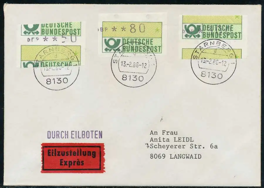 Eilbrief mit ATM1-300 und 080 und 050, sogenannter "Starnberger Reiter bzw. Starnberger Springer", beiliegend Quittung des Automaten mit Datum 14.02.1986