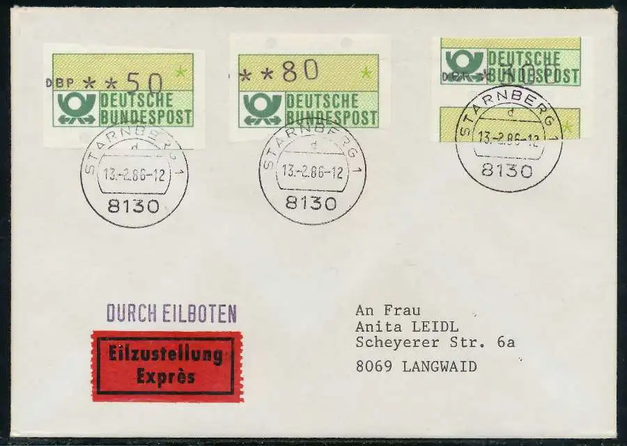 Eilbrief mit ATM1-300 und 080 und 050, sogenannter "Starnberger Reiter bzw. Starnberger Springer", beiliegend Quittung des Automaten mit Datum 14.02.1986