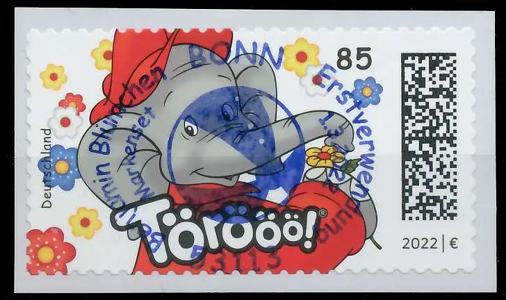 0,85 Euro aus der Ausgabe Benjamin Blümchen Törööö, selbstklebend auf farbigem Folienträger, Erstverwendungsstempel