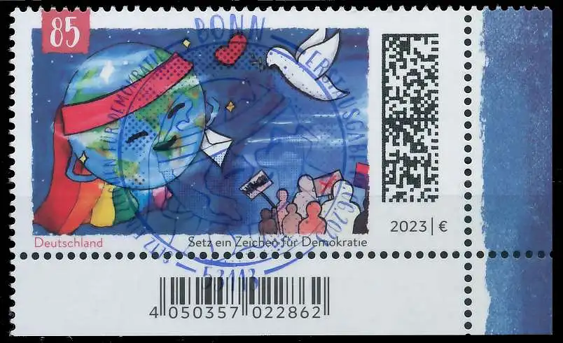 0,85 Euro Wert aus der Ausgabe Setz ein Zeichen für Demokratie, Ersttagssonderstempel
