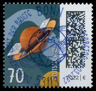 0,70 Euro aus der Ausgabe Welt der Briefe, Bogenmarke, Hintergrund der Wertziffer gräulichgrün, Ersttagssonderstempel