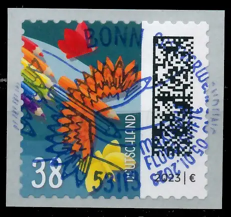 0,38 Euro aus der Ausgabe Welt der Briefe, selbstklebend auf Folienstreifen, Ersttagssonderstempel