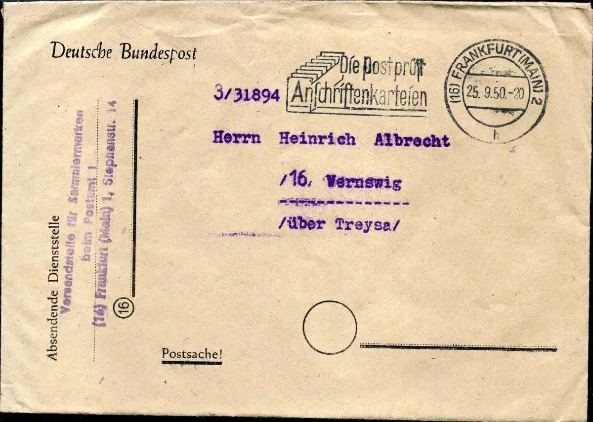 Freie Bezeichnung: BRD Brief Postsache (16) FRANKFURT (MAIN) 2 h - Vernswig /Treysa 26.4.51 - Die Post prüft Anschriftenkarteien