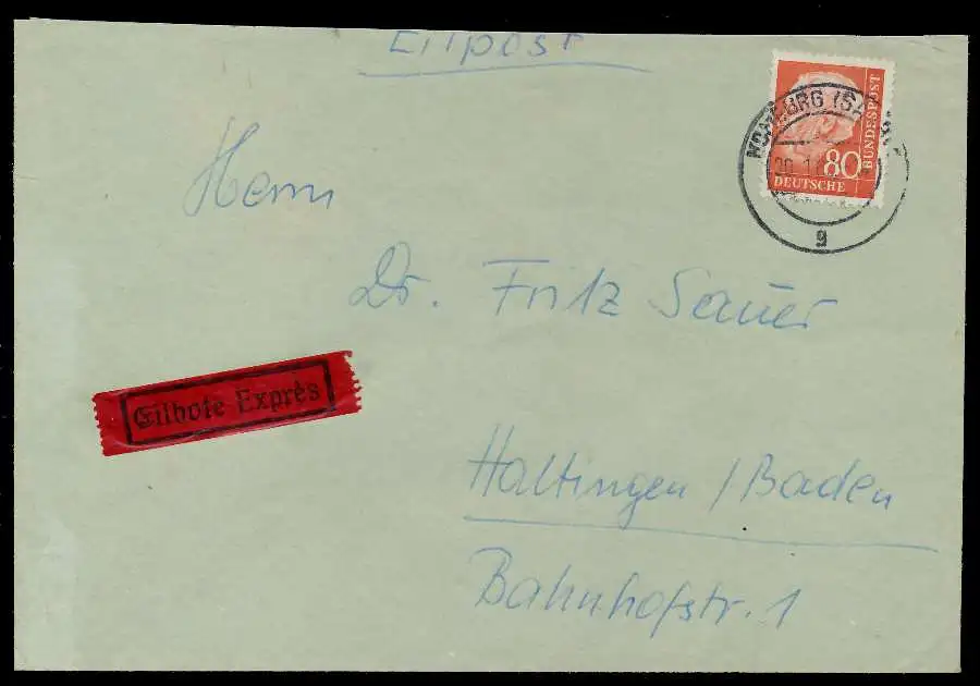 80Pfg Wert aus der Ausgabe Heuss II, weisses Papier, rückseitig AKS Haltingen