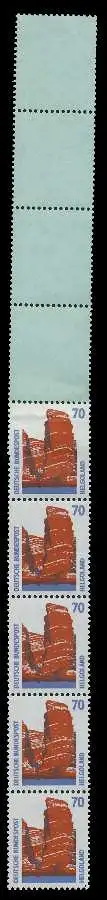070 Pfg Wert aus der Ausgabe Sehenswürdigkeiten, 5er Streifen, am Übergang von den grünen Leerfeldern zur ersten Marke gefaltet