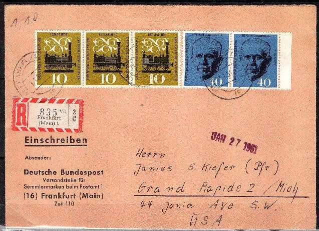 BRD, Michel Nr. 344 + 345 Einschreiben in die USA mit Mehrfachfrankatur.
