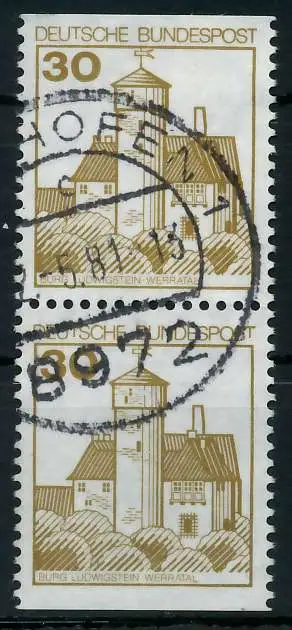 030 Pfg Wert aus der Ausgabe Burgen und Schlösser, oben und unten geschnitten aus Markenheftchen als senkrechtes Paar (MichelNr.: 1192914, 914C, 914D)