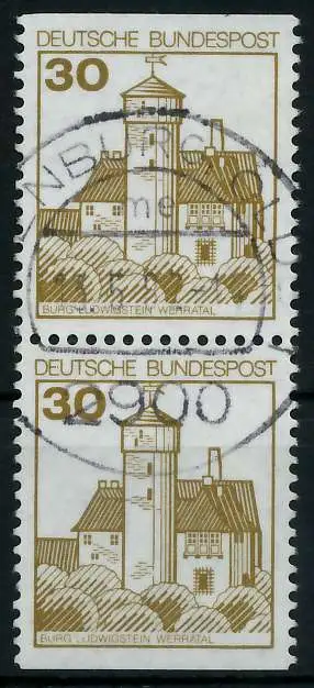 030 Pfg Wert aus der Ausgabe Burgen und Schlösser, oben und unten geschnitten aus Markenheftchen als senkrechtes Paar (MichelNr.: 1192914, 914C, 914D)