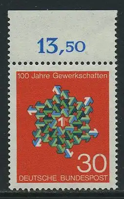 BUND 1968 Michel-Nummer 0570 postfrisch EINZELMARKE RAND oben (c)