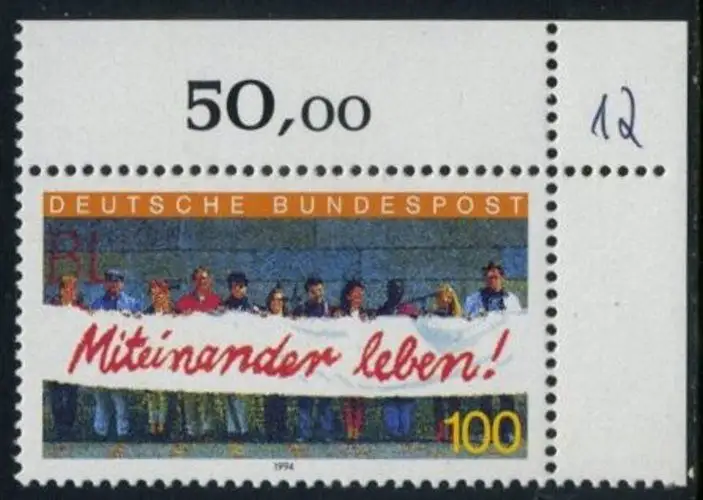 BUND 1994 Michel-Nummer 1725 postfrisch EINZELMARKE ECKRAND oben rechts (a)