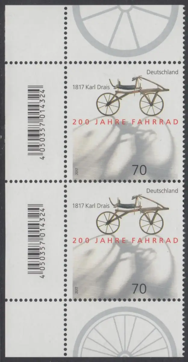 BUND 2017 Michel-Nummer 3320 postfrisch vert.PAAR ECKRÄNDER oben/unten links