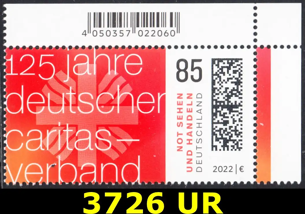 BUND 2022 Michel-# 3726 postfrisch EINZELMARKE ECKRAND oben rechts