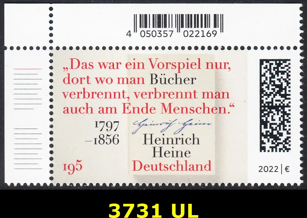 BUND 2022 Michel-# 3731 postfrisch EINZELMARKE ECKRAND oben links