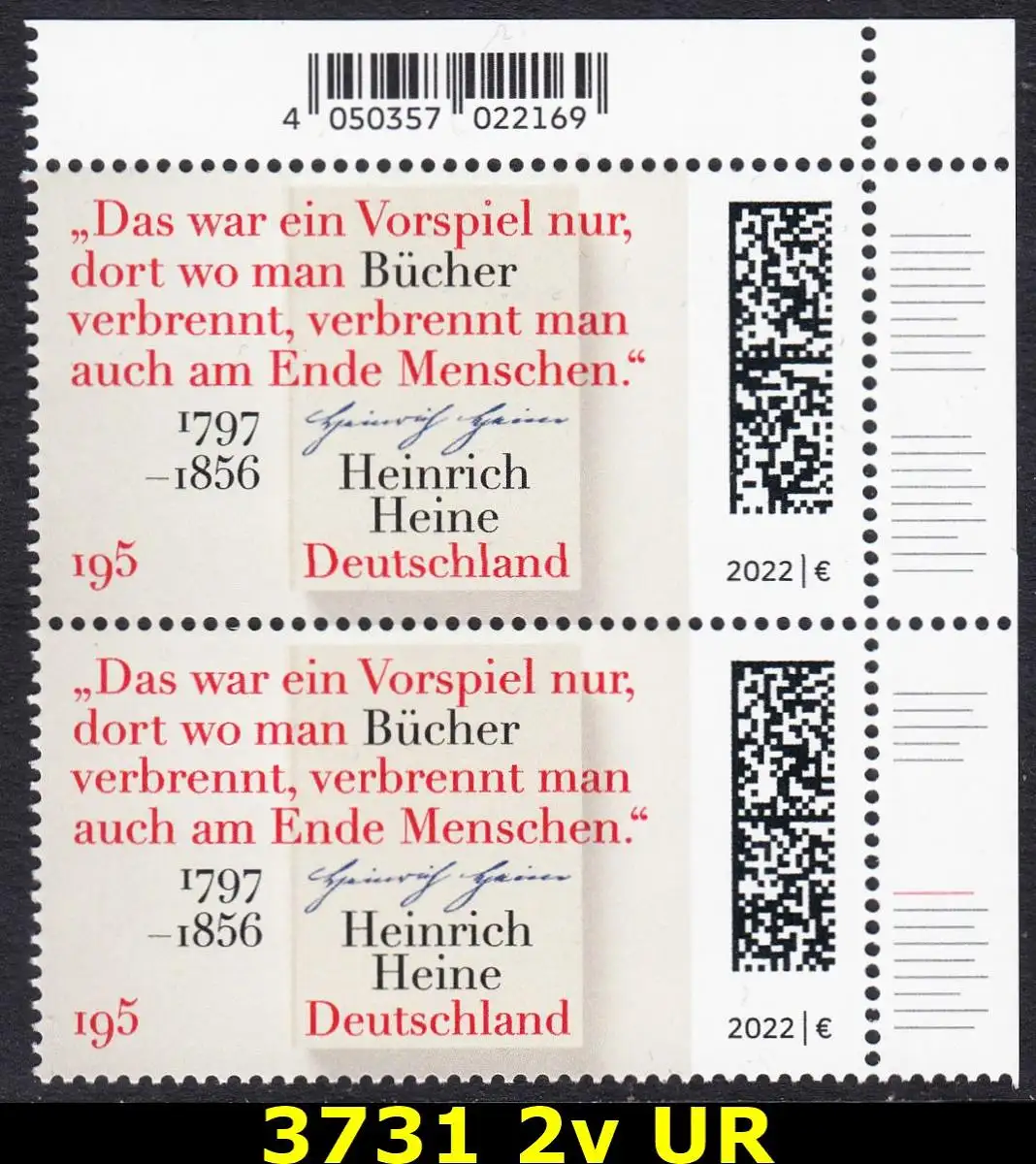 BUND 2022 Michel-# 3731 postfrisch vert.PAAR ECKRAND oben rechts