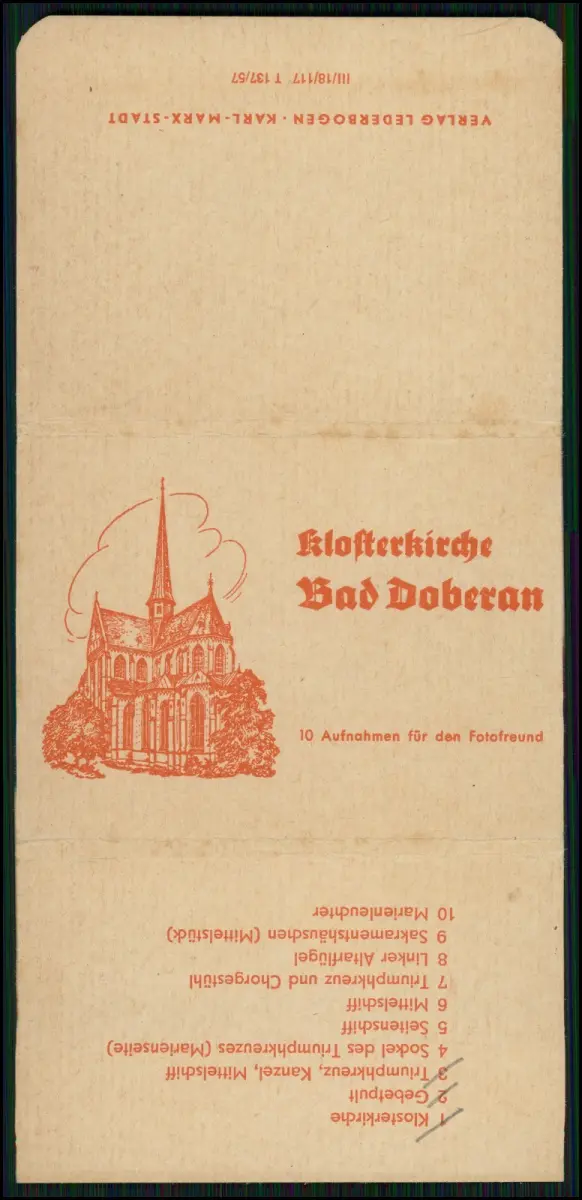 Originale Fotomappe Klosterkirche Bad Doberan, herausgegeben vom Verlag Lederbogen Karl-Marx-Stadt, hergestellt in der DDR im Jahr 1957 (Druckvermerk: III/18/117 T 137/57). Enthält sechs Schwarzweiß-Fotos im Format 9x6 cm, mit eindrucksvollen Innen- und Außenaufnahmen der berühmten Backsteinkirche von Bad Doberan.
