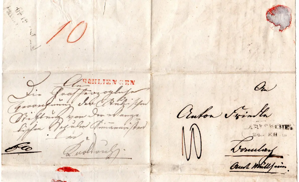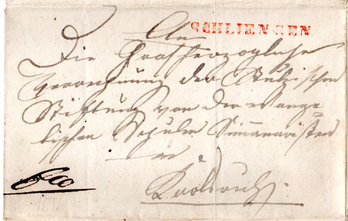 Baden 1846, L1 Schliengen u. R2 Carlsruhe auf 2mal verwendetem Faltbrief