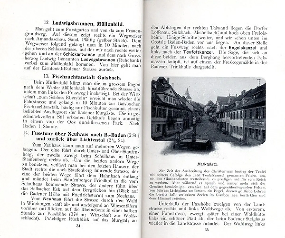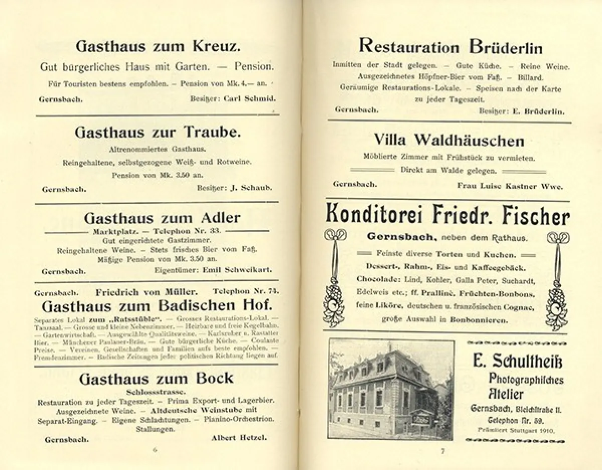 mit GESAMT 80 Seiten photographischen Abbildungen einer Karte der Umgebung Verkehrs und Behördenübersicht Geschichte von Gernsbach Beschreibung des Ortes seine Hotels und Sehenswürdigkeiten Hinweise für Ausflüge und Wanderungen in das Murgtal und zum schloss Eberstein zum Bernstein und nach Loffenau nach Obersrot zur Teufelsmühle Kaltenbrunn und Schönmünznach Außerdem Anzeigen und Inserate regionale Gaststätten Firmen und Geschäftswerbung auf 18Seiten