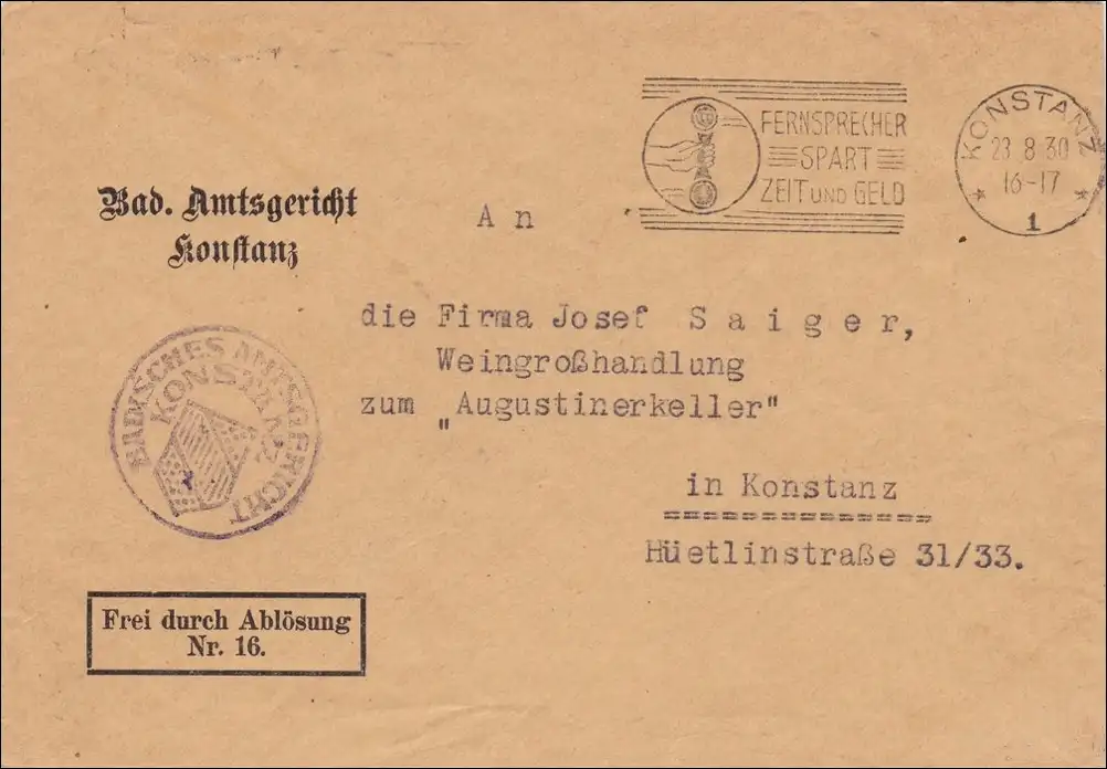 Badisches Amtsgericht Konstanz an Weingroßhandlung Augustinerkeller 1930