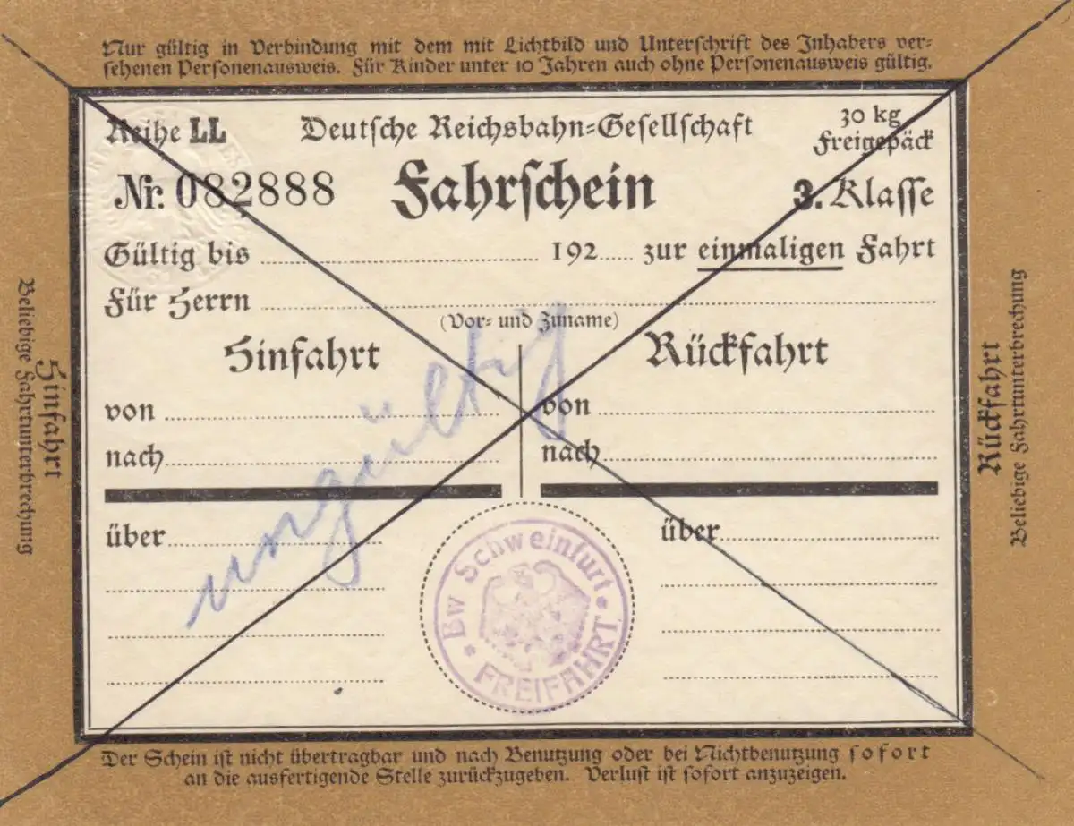 Bahnpost: Fahrschein 3. Klasse, Schweinfurt, ungültig