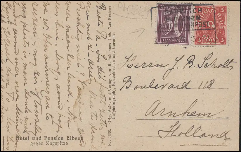 Ansichtskarte Hotel und Pension Eibsee gegen Zugspitze mit Mischfrankatur laut Abbildung per Bahnpost nach Arnheim / Holland.