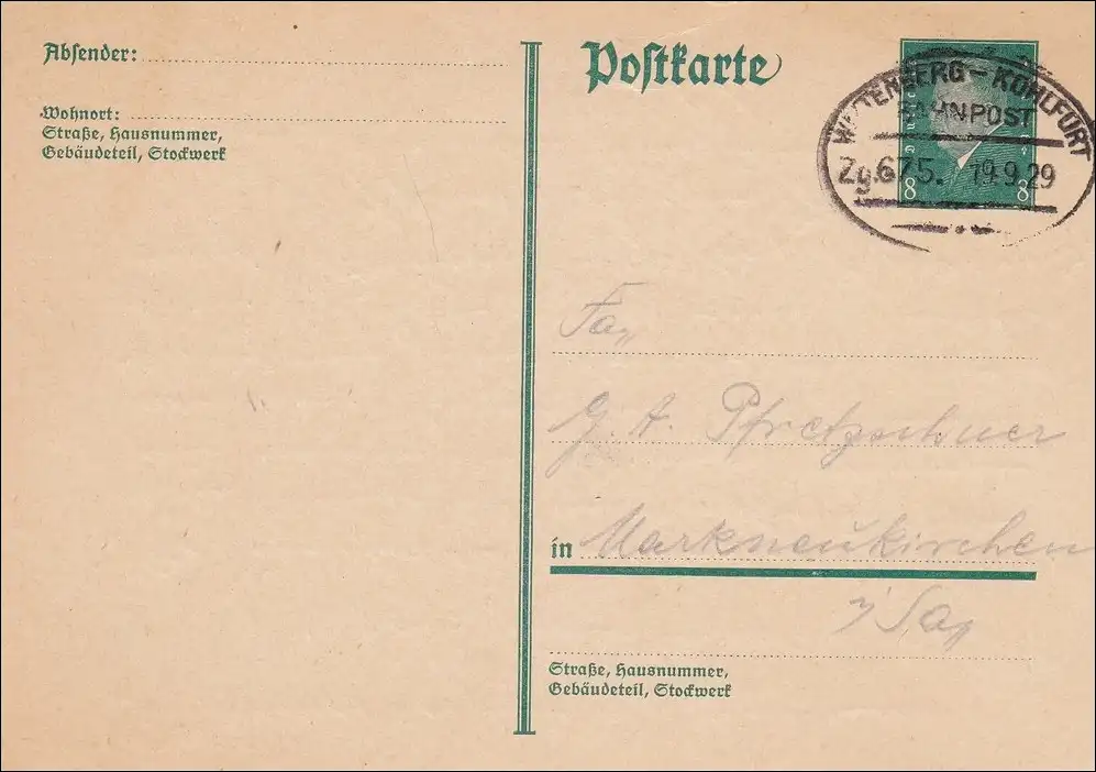 Bahnpost: Ganzsache mit Zugstempel Wittenberg-Kohlfurt 1929