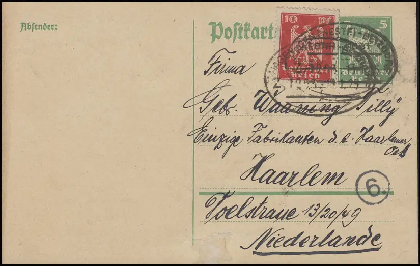 Als Auslands-Postkarte nach Haarlem / Niederlande mit Kreisstempel 6.