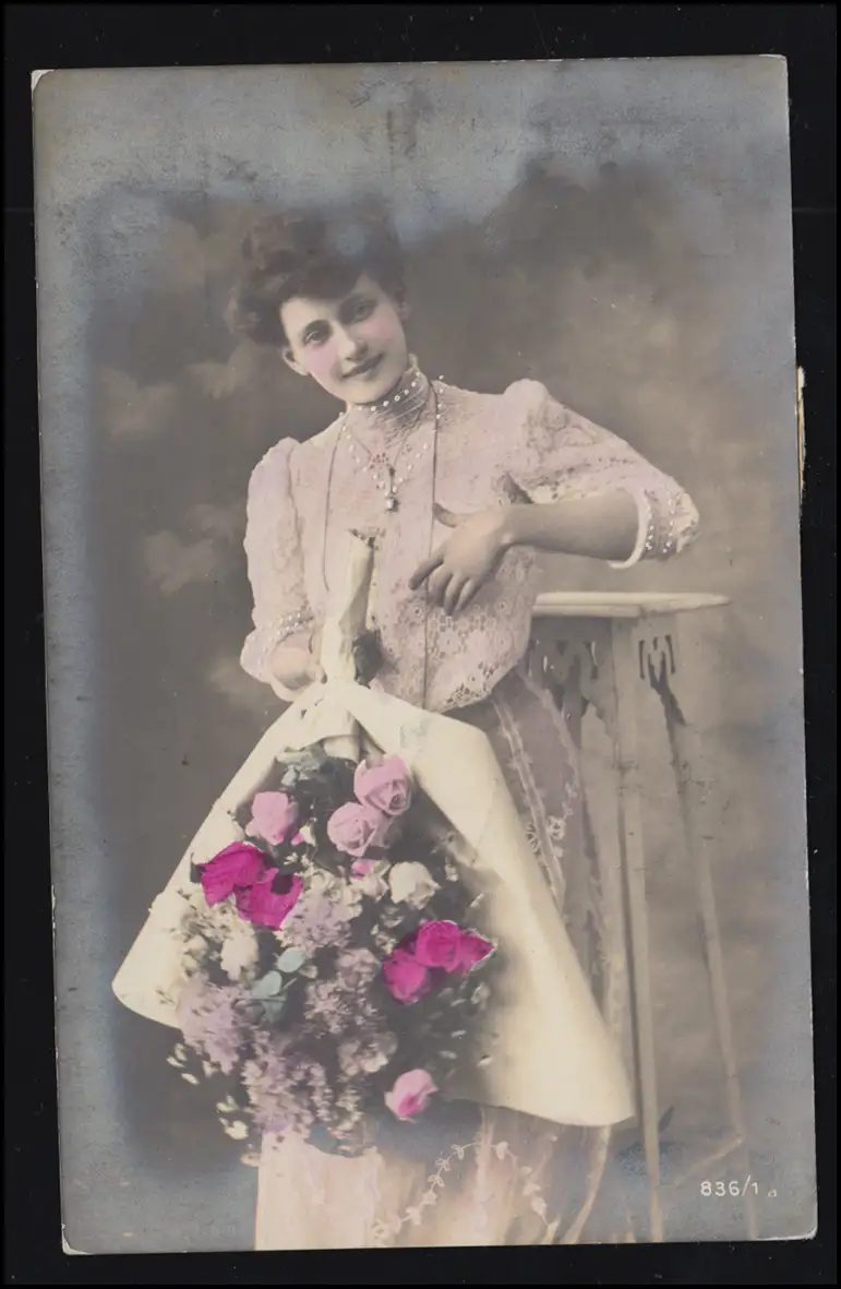 Bahnpost TRIEST-WIEN 172 - 7.7.1909 mit Spendenmarke auf Mode-AK Frau mit Blumen