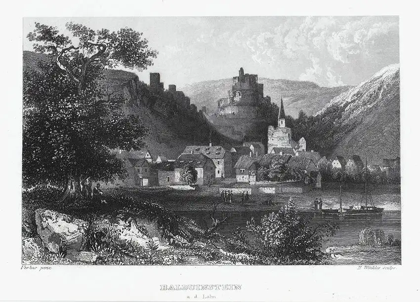 Balduinstein an der Lahn. Echter Stahlstich um 1850