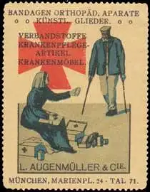 orthopädische Aparate, künstliche Glieder, Verbandstoffe, Krankenpflegeartikel, Krankenmöbel, Größe/Zustand: 6x5 , guter Zustand, Original alte Reklamemarke die seinerzeit für die Werbung benutzt wurde