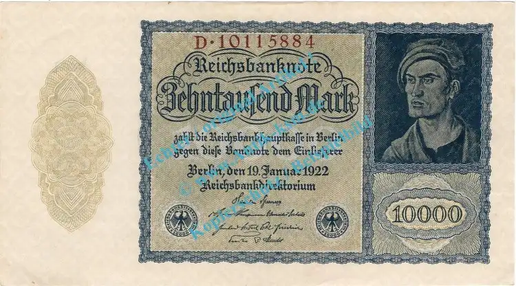 Banknote , 10.000 Mark Schein in L-gbr. DEU-78.b, Ros.69, P.72, Weimarer Republik 1922 Inflation