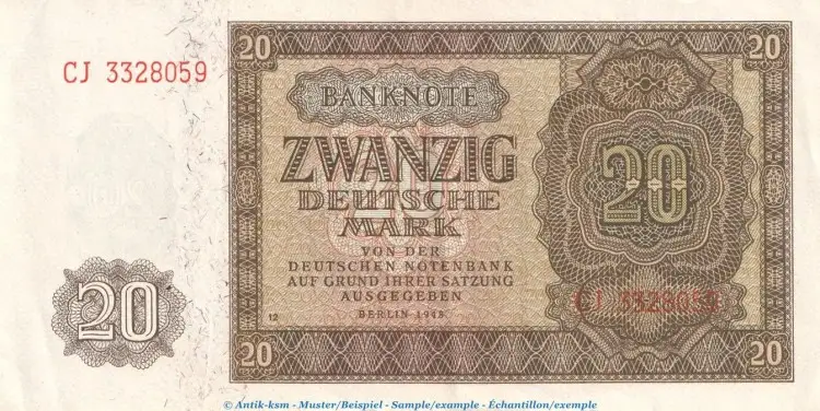 Banknote über Zwanzig Deutsche Mark von 1948 , Deutsche Notenbank - DDRGrabowski / Rosenberg / Pick : DDR-6 / 344 / P.13
