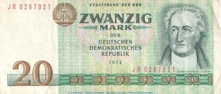 Banknote über Zwanzig Mark von 1975 , Staatsbank der DDRGrabowski / Rosenberg / Pick : DDR-24.a,c / 362 / P.29