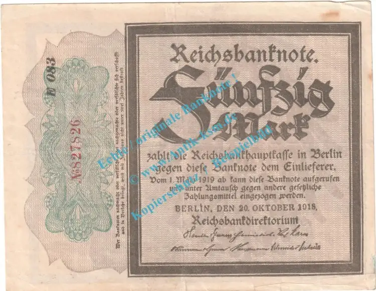 Gutschein / Banknote über Fünfzig Reichsmark von 1918 , Kaiserreich - deutsche ReichsbankGrabowski / Rosenberg / Pick : DEU-44.c / 56 / P.64