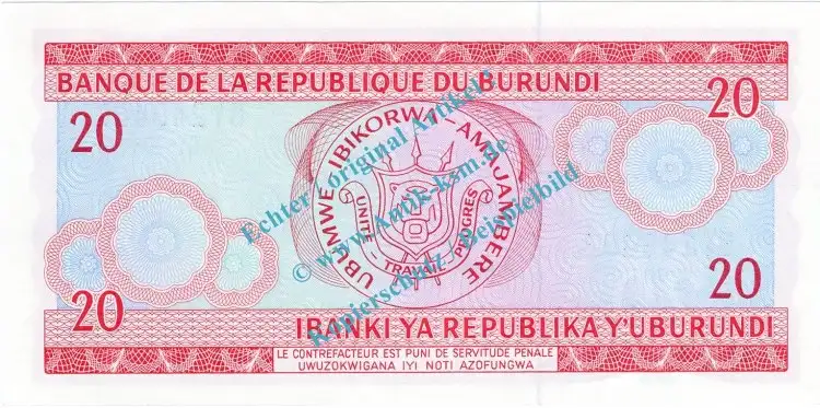 Banknote Burundi - Burundi , 20 Francs Schein -Tänzer re.- von 1989 in unc - kfr