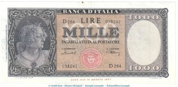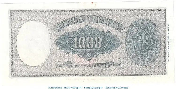 Banknote Italien / Italia , 1.000 Lire Schein von 1949Land : Italien  ,  Katalog World Banknotes  : 88.b