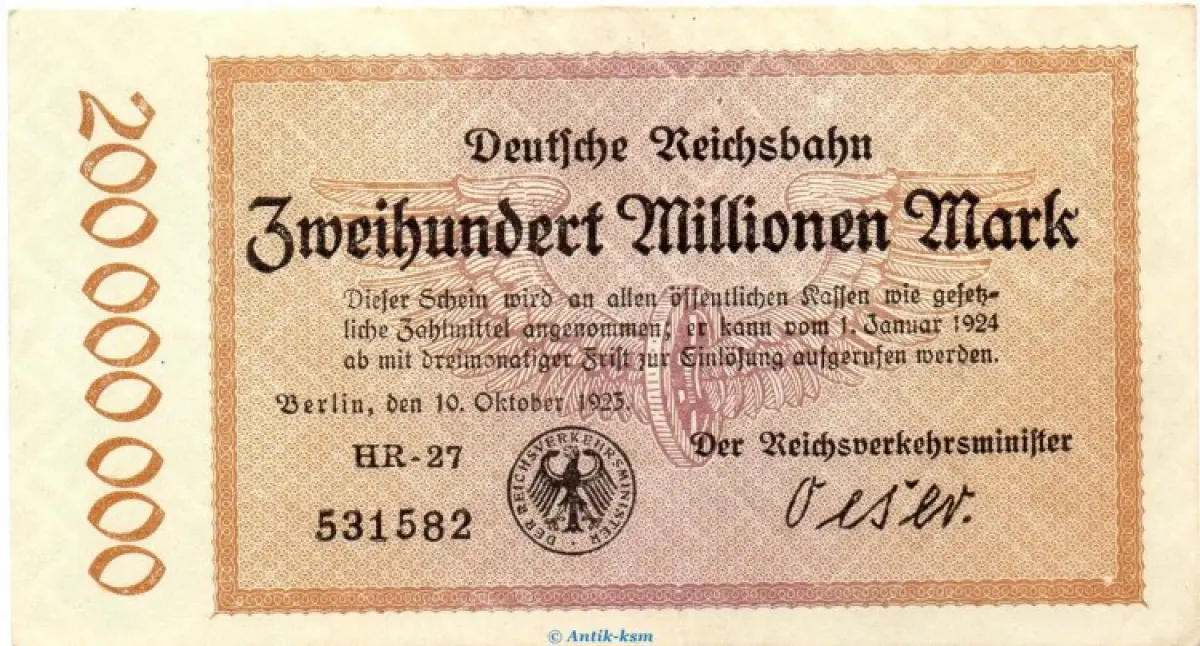 Banknote über Zweihundert Millionen Mark von 1923 , Inflation , Deutsche ReichsbahnGrabowski / Pick  : RVM-8 / S.1018