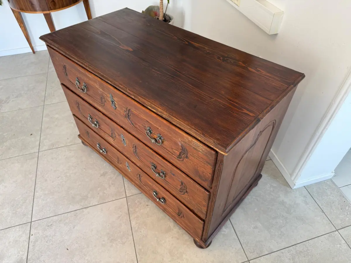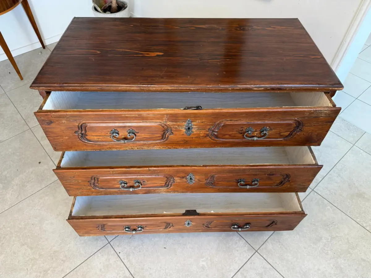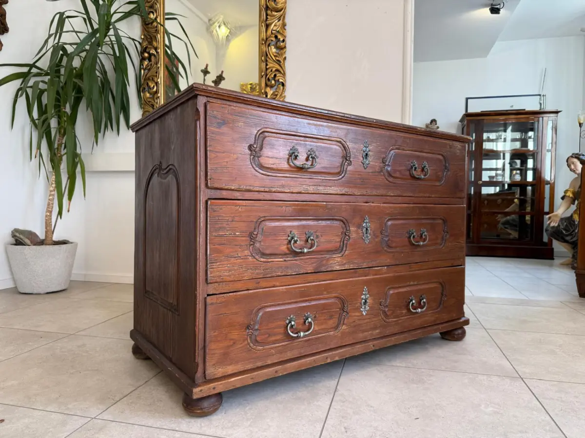 Die Kommode zeigt kräftige, geschwungene Formen mit typischen Barockprofilen und elegantem Fußabschluss.