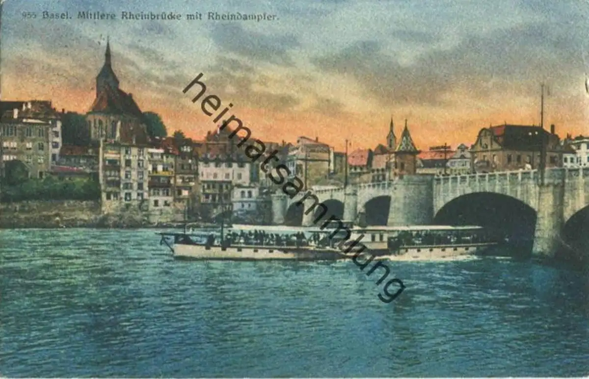 Basel - Mittlere Rheinbrücke mit Rheindampfer - Verlag Paul Schmidt Basel - gel. 1927
