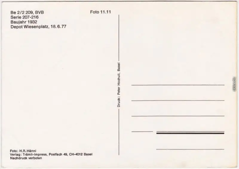 Basel Straßenbahn Be 2/2 209 BVB vor Depot Wiesenplatz 1988