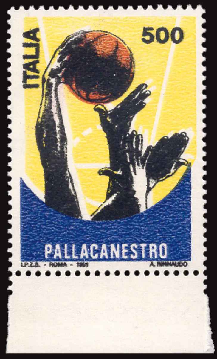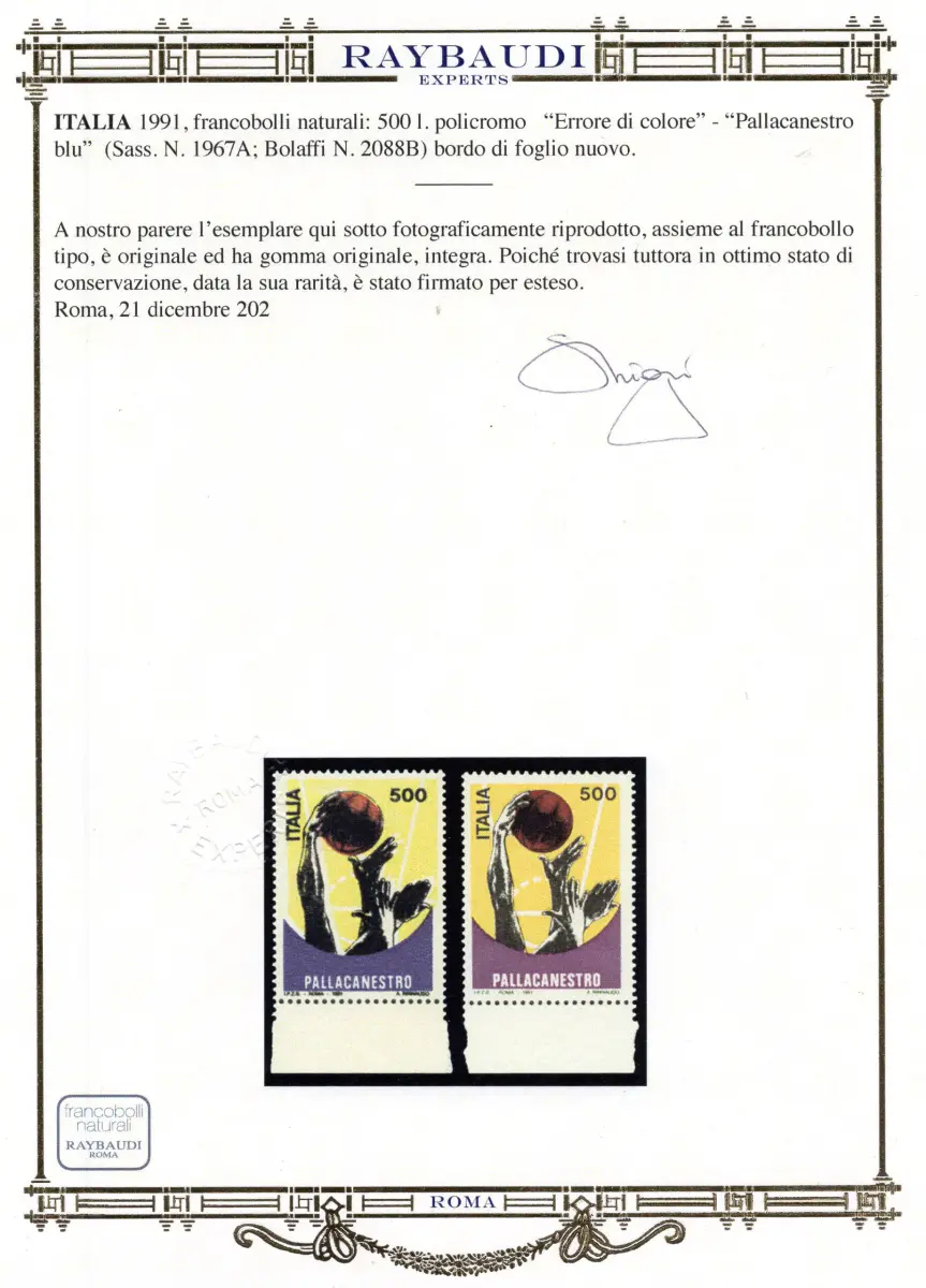 MNH - Vollgummi - Basketball Lire 500 Nr. 1967A wunderschönes Exemplar b. von f. des sehr seltenen Farbfehlers - einziger bekannter Fall in der Italienischen Republik, in dem die Farbunterschiede zur Mustermarke auf die tatsächliche Verwendung beim Drucken von dunklem Übersee anstelle von Violett zurückzuführen sind - Dies ist eine der schönsten Briefmarken aus dem einzigen bekannten Bogen - Cert. Ray. gold - Naturmarke - Kat. euro 18.500 Cod. 907/17