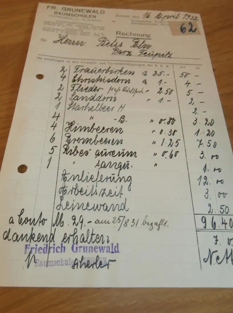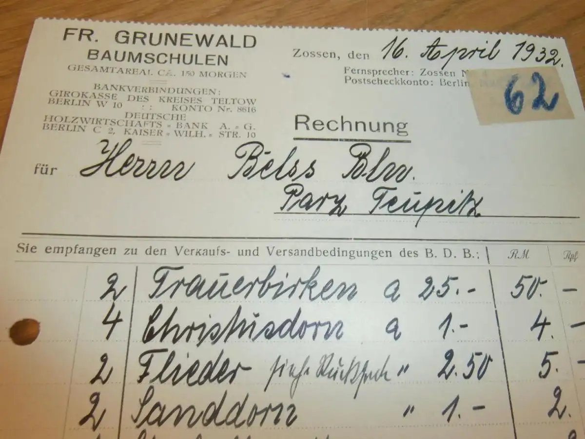 Baumschule - Fr. Grunewald in Zossen , 1932 , Reklame , Gärtnerei , Gartenbau , alte Rechnung , altes Dokument !AZ9-X
