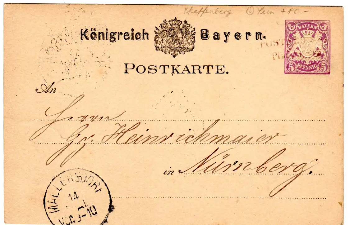 Bayern 1880, L2 Postablage PFAFFENBERG auf 5 Pf. Ganzsache