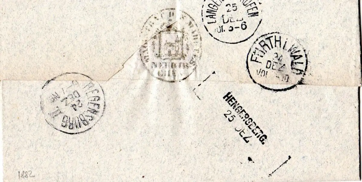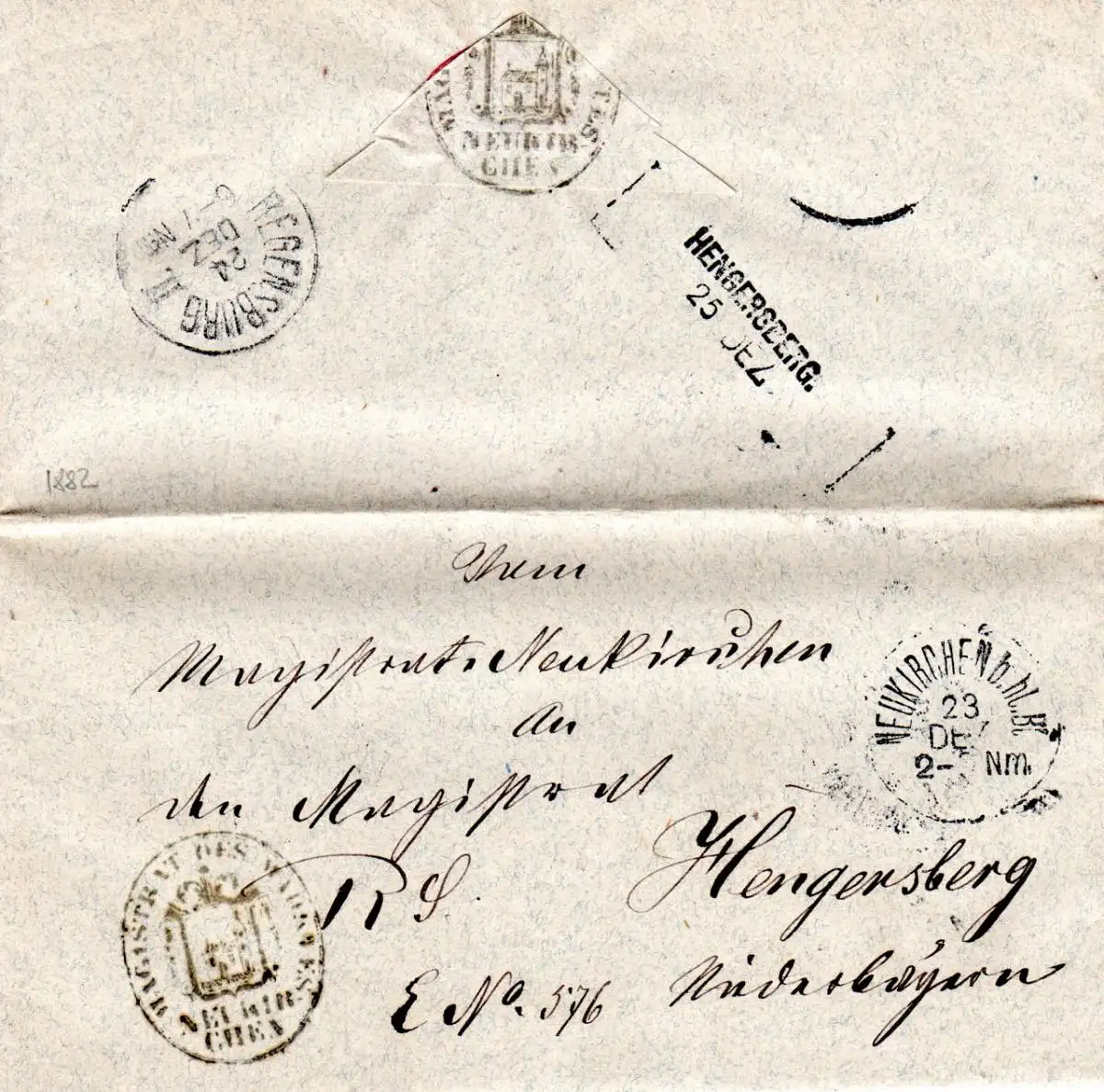Magistratsbrief m. Siegelstempel u. K1 Neukirchen b. hl. Bl. über Furth i.W., Regensburg u. Langenisarhofen nach Hengersberg. Aushilfsstempel v. 26. Dez. als Ankunftstempel.