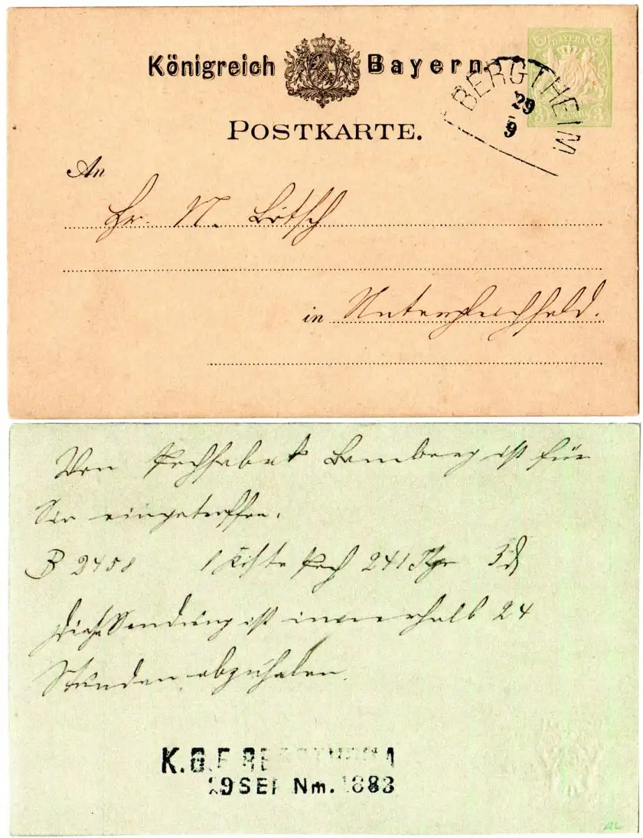 Sauber gebr. Ganzsachenkarte m. HKS Bergtheim. Rückseitig L2 K.G.E. BERGTHEIM 1 29 SEP Nm. 1883