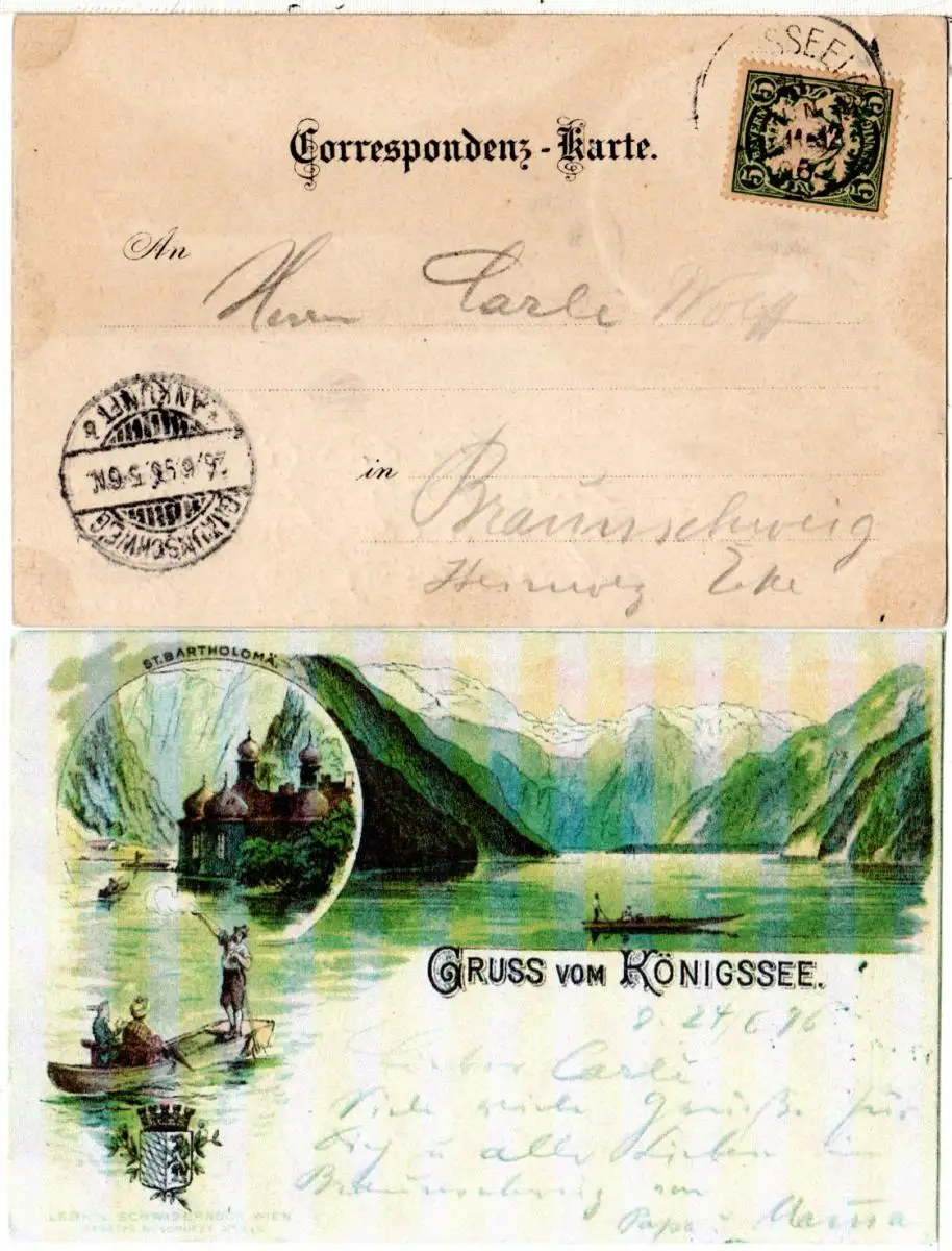 Bayern 1896, Saison-Postamt-K1 KÖNIGSSEE auf Vorläufertype Litho-AK m. 5 Pf.