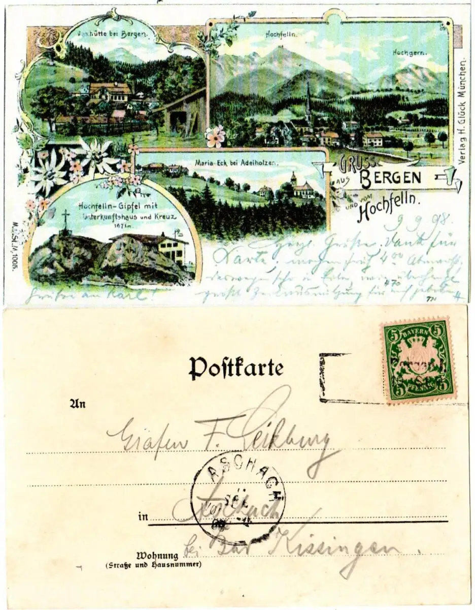 Bayern 1898, L2-Aushilfstpl. Bergen 1. auf Gruss aus-LItho AK m. 5 Pf.